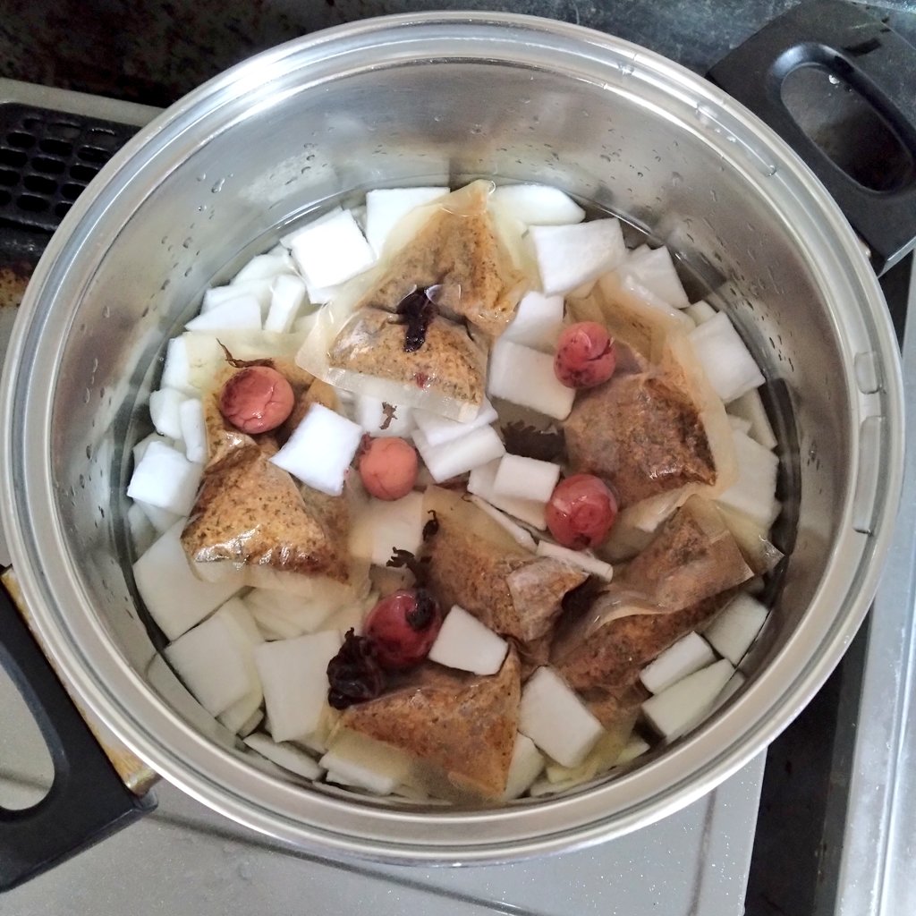 鍋に水1.5L、大根1/2本、「出旨王」5包、梅干し(小)5個を加えて煮るだけで完成です